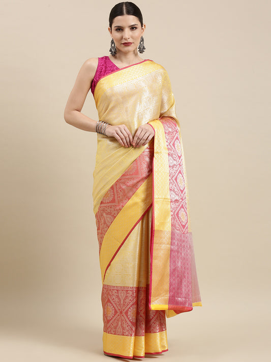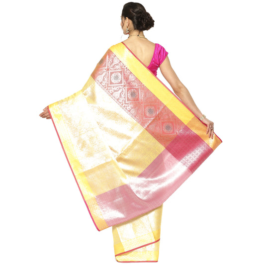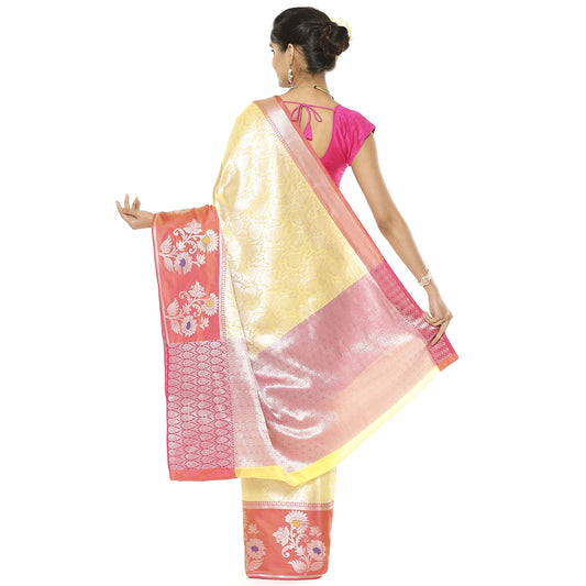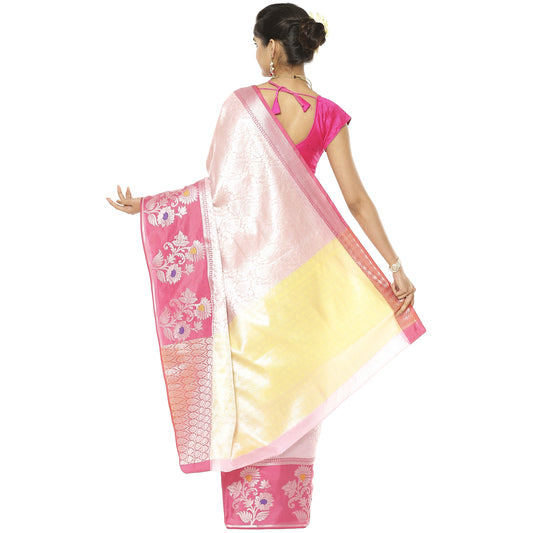 Faishana Presents Pink Silver Zari Kanchi Silk Tanchoi Brocade Contrast Pink & Yellow Skirt Meena Border Banarasi Saree
