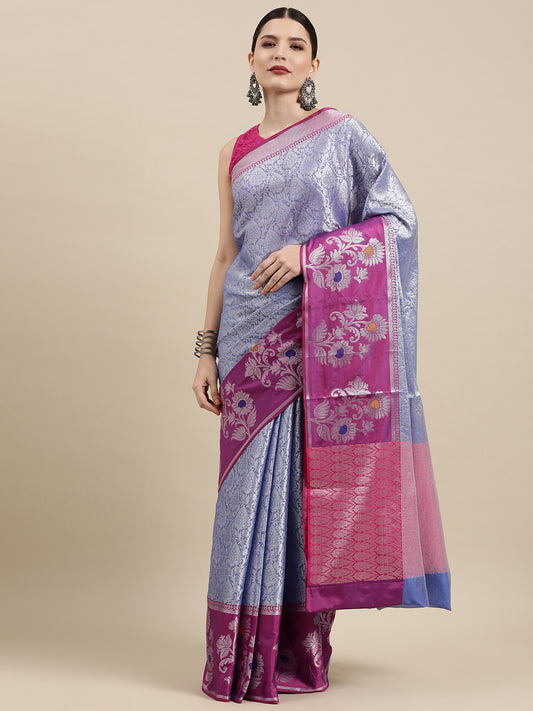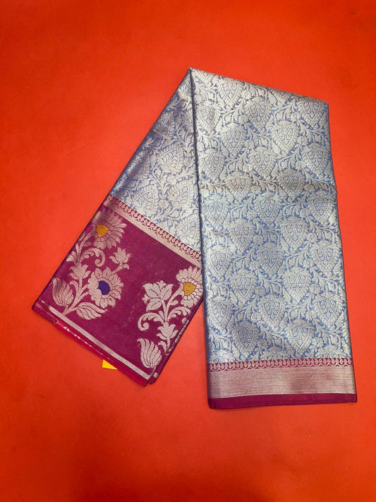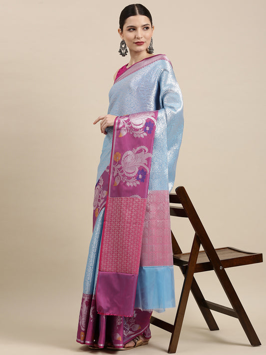 Faishana Presents Blue Silver Zari Kanchi Silk Tanchoi Brocade Contrast Magenta Skirt Meena Border Banarasi Saree