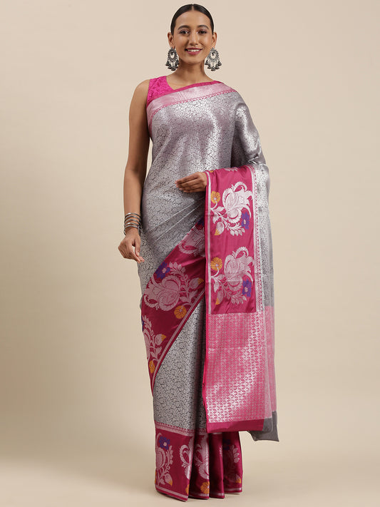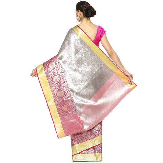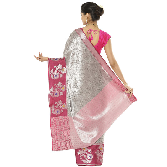 Faishana Presents Grey Silver Zari Kanchi Silk Tanchoi Brocade Contrast Pink Skirt Meena Border Banarasi Saree