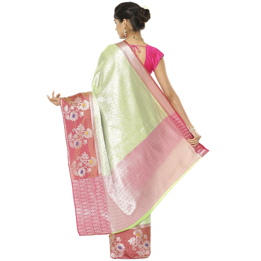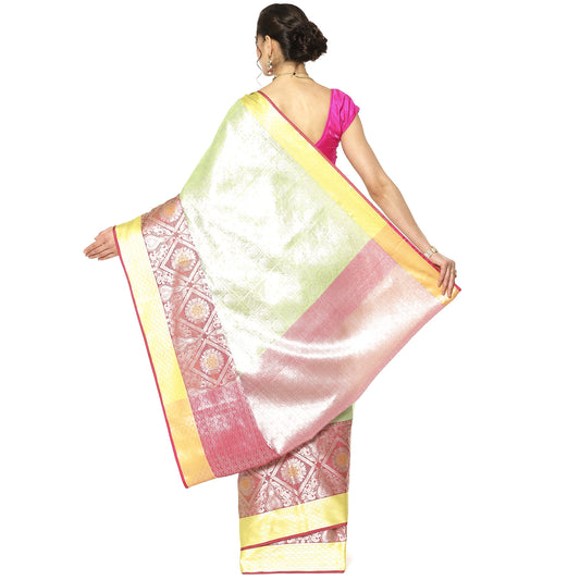 Faishana Presents Green Silver Zari Kanchi Silk Tanchoi Brocade Contrast Pink & Yellow Skirt Meena Border Banarasi Saree