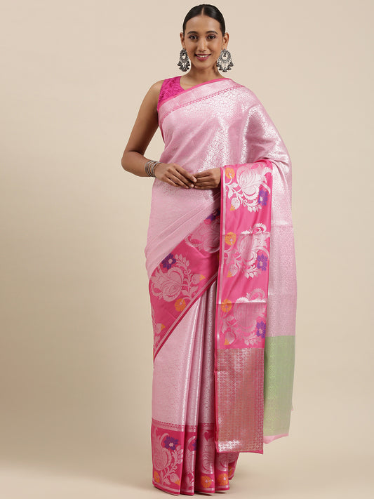 Faishana Presents Pink Silver Zari Kanchi Silk Tanchoi Brocade Contrast Pink Skirt Meena Border Banarasi Saree