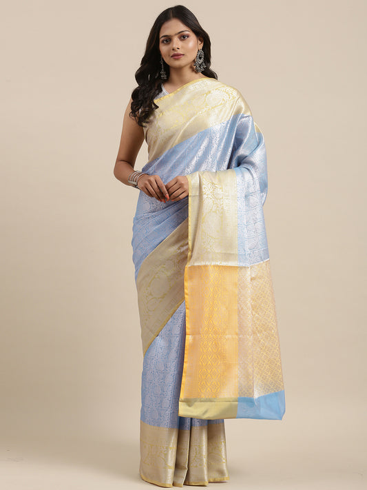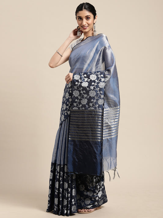 Faishana Presents Blue Silver Zari Kanchi Silk Tanchoi Brocade Contrast Gold Skirt Meena Border Banarasi Saree