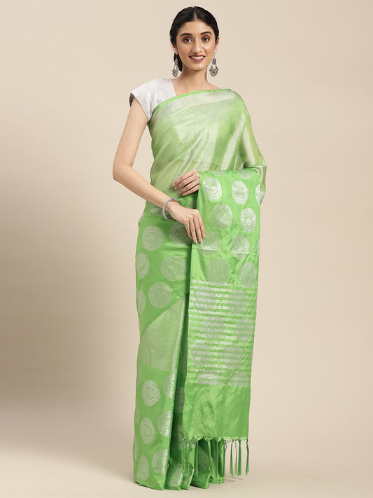 Faishana Presents Green Silver Zari Glass Tissue Tanchoi Contrast Large Border Banarasi Saree