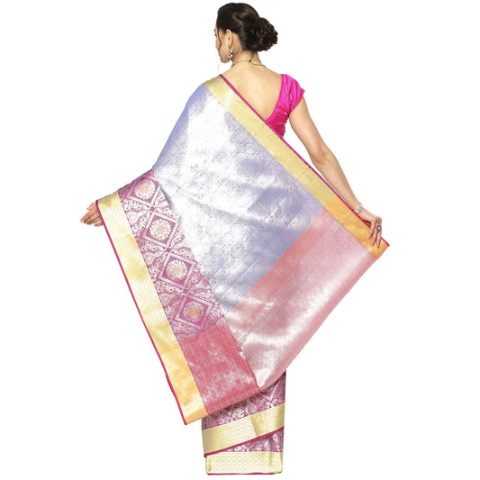 Faishana Presents Lavender Silver Zari Glass Tissue Tanchoi Contrast Large Border Banarasi Saree