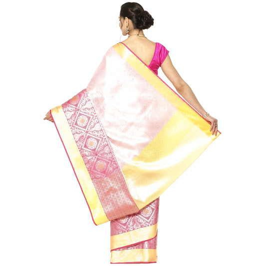 Faishana Presents Pink Silver Zari Kanchi Silk Tanchoi Brocade Contrast Gold Skirt Meena Border Banarasi Saree