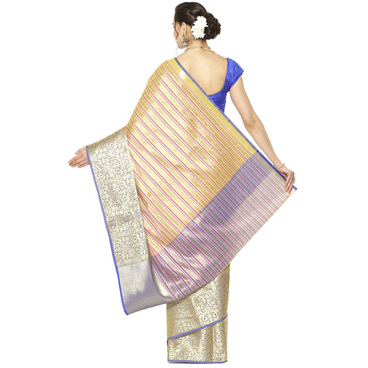Faishana Presents Beige Zari Strip Kanchi Silk Tanchoi Brocade Contrast Blue Skirt Border Banarasi Saree