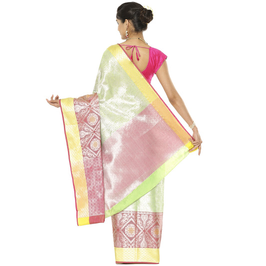 Faishana Presents Light Green Kanchi Silk Zari Brocade Contrast Meena Pink Pattu Border Banarasi Saree
