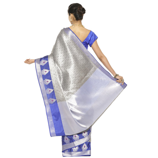 Faishana Presents Grey Silver Zari Kanchi Silk Tanchoi Brocade Contrast Blue Skirt Meena Border Banarasi Saree
