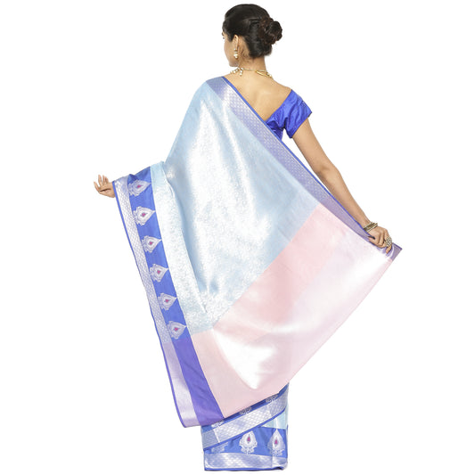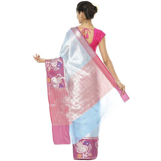 Faishana Presents Blue Silver Zari Kanchi Silk Tanchoi Brocade Contrast Pink Skirt Meena Border Banarasi Saree