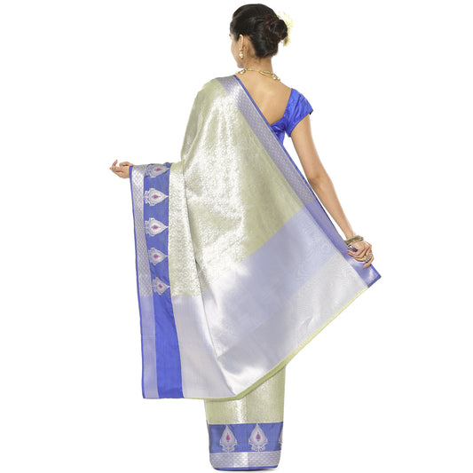 Faishana Presents Green Silver Zari Kanchi Silk Tanchoi Brocade Contrast Blue Skirt Meena Border Banarasi Saree