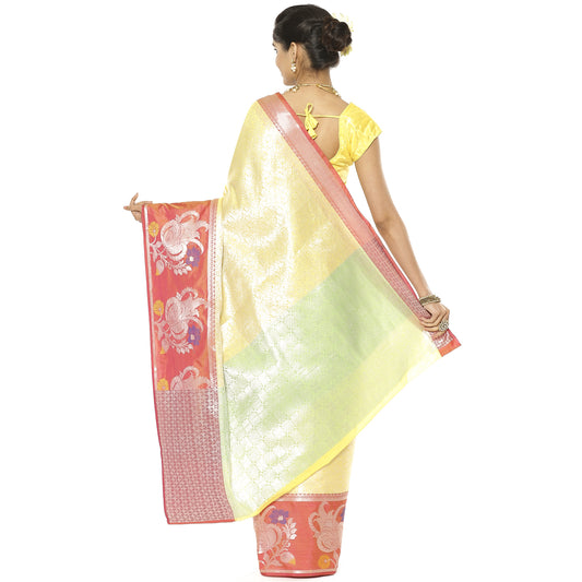 Faishana Presents Pink Silver Zari Kanchi Silk Tanchoi Brocade Contrast Pink & Yellow Skirt Meena Border Banarasi Saree
