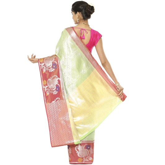 Faishana Presents Green Silver Zari Kanchi Silk Tanchoi Brocade Contrast Pink & Yellow Skirt Meena Border Banarasi Saree