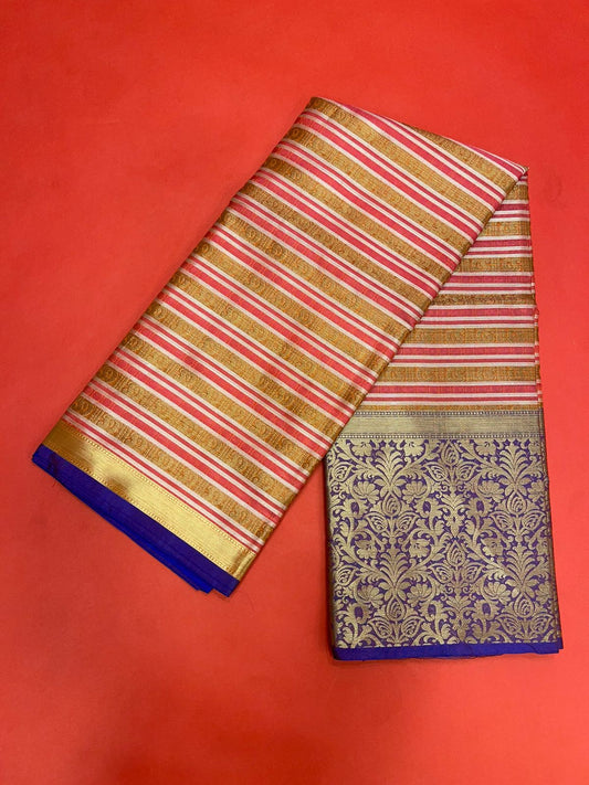 Faishana Presents Light Red Zari Strip Kanchi Silk Tanchoi Brocade Contrast Purple Skirt Border Banarasi Saree