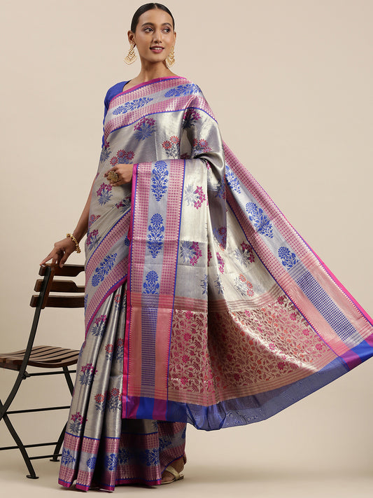 Faishana Presents Silver Zari Kanchi Silk Brocade Contrast Silver Jamawar Border Banarasi Saree