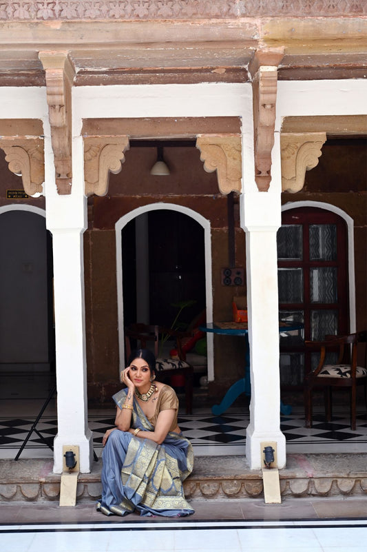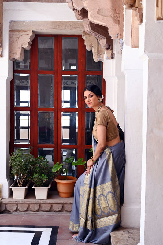 Faishana Presents Grey Valkalam Katan Silk Zari Plain Anchal Zari Border Banarasi Saree