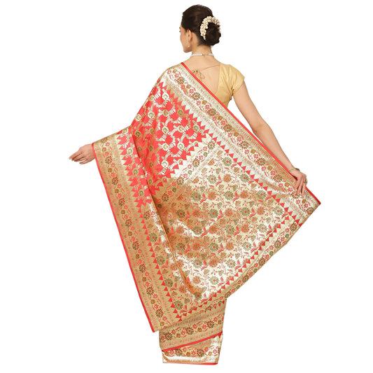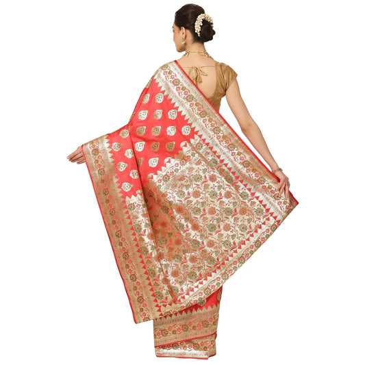 Faishana Presents Light Red Katan Silk Tanchoi Floral Zari Mina Jaal with Banarasi Floral Minakari Zari Border and Big Boota Pallu with Light Red Blouse