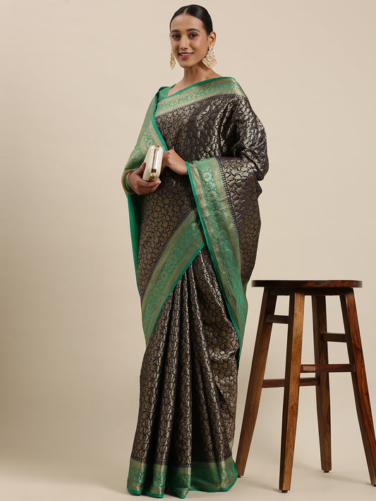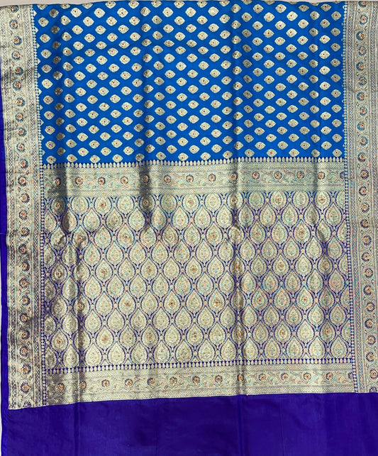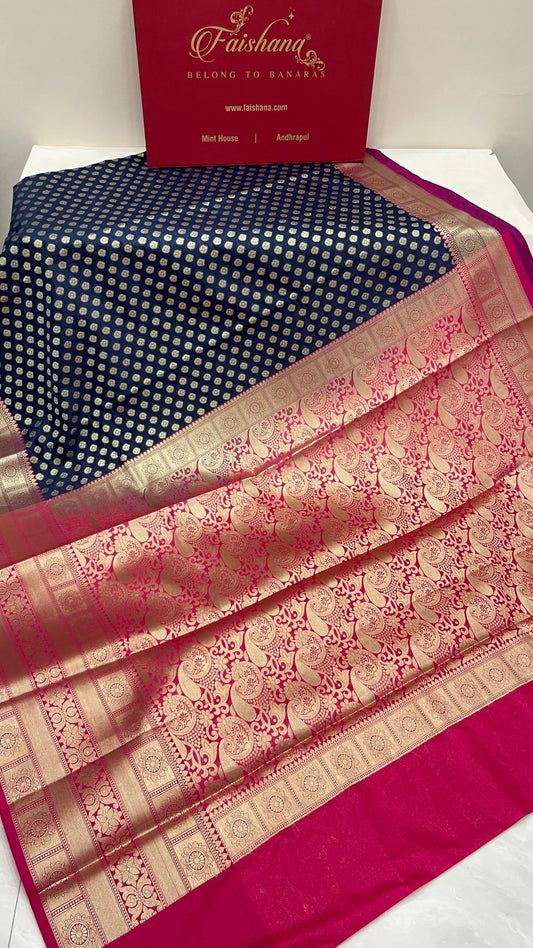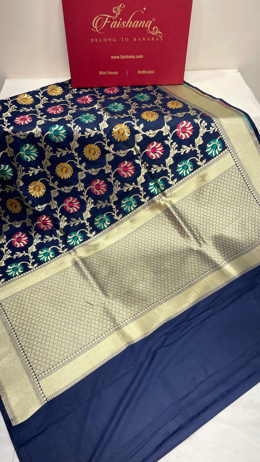 Faishana Presents Navy Blue Katan Silk Floral Mina Zari Jaal Boota with Banarasi Zari Border and Navy Blue Blouse