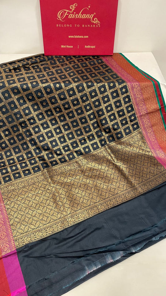 Faishana Presents Black Katan Silk Golden Zari Checkered Dot Booti with Dual Shade Zari Border and Black Blouse