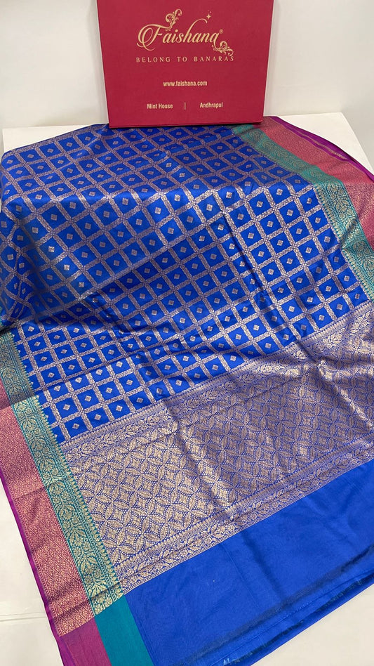 Faishana Presents Royal Blue Katan Silk Golden Zari Checkered Booti with Dual Shade Zari Border and Blue Blouse