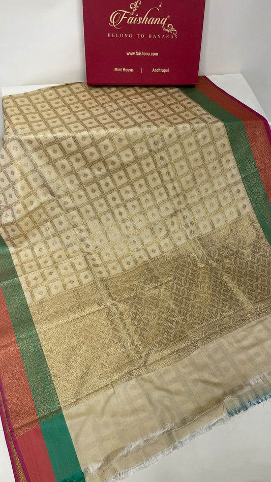 Faishana Presents Off-white Katan Silk Golden Zari Checkered Booti with Dual Shade Zari Border and Off-white Blouse