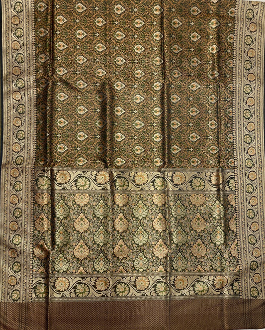 Faishana Presents Dark Green Katan Silk Golden Zari Floral Tilfi Mina Jaal Banarasi Dual Shade Zari Border and Floral Jaal Pallu with Green Blouse