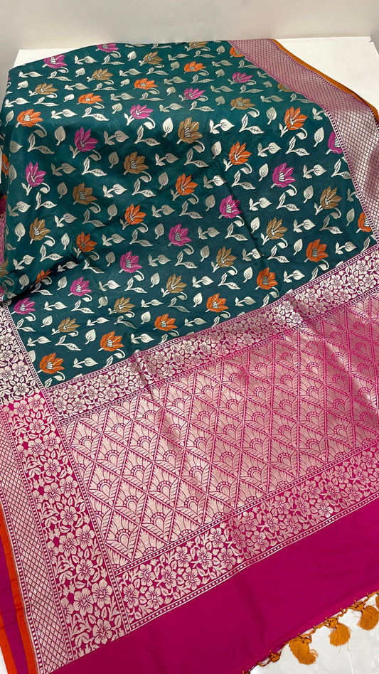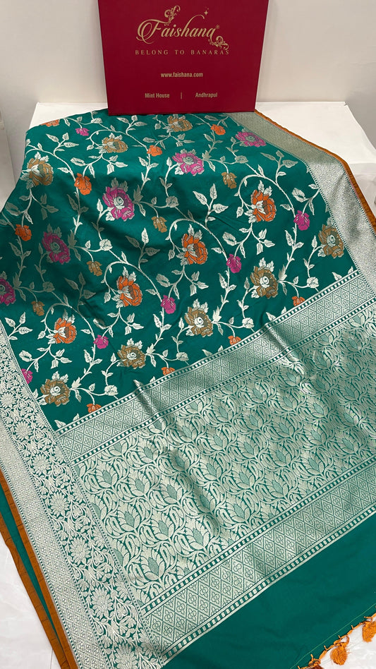 Faishana Presents Dark Green Katan Silk Tanchoi Floral Zari Mina Booti Jaal with Banarasi Floral Minakari Zari Border and Big Boota Pallu with Dark Green Blouse