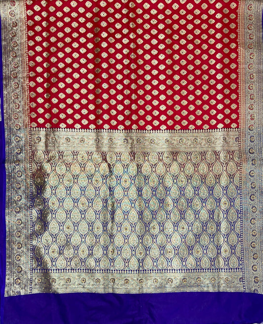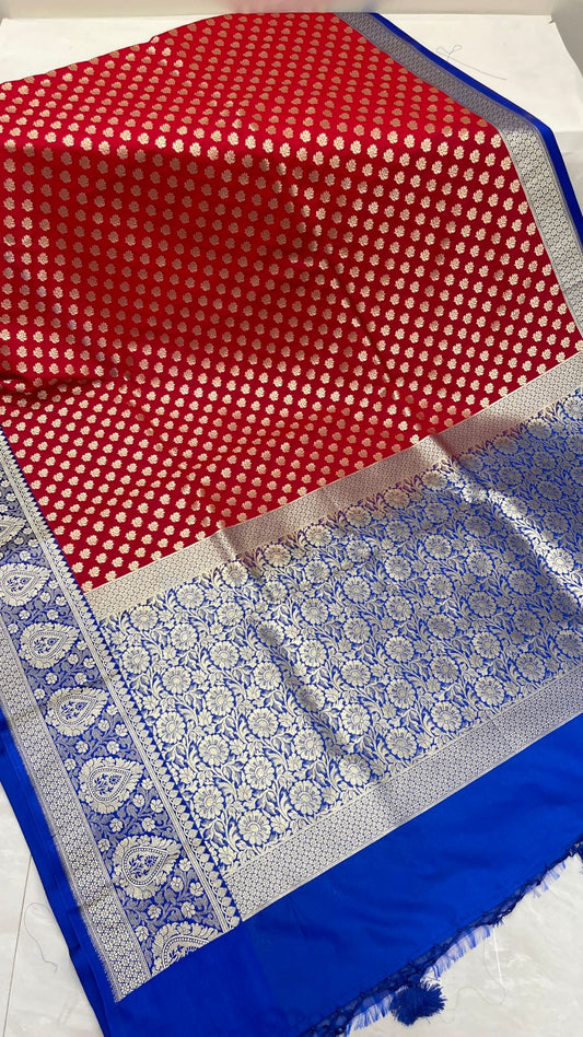 Faishana Presents Red Katan Silk Golden Zari Floral Chunri Booti with Contrast Blue Silver Zari Border and Floral Jaal Pallu with Blue Blouse