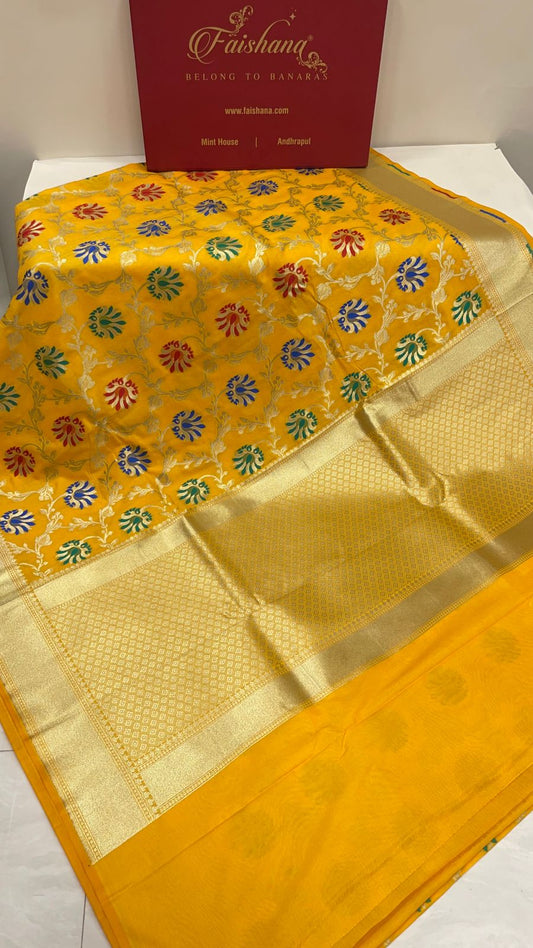 Faishana Presents Gold Katan Silk Floral Minakari Boota Golden Zari Jaal with Banarasi Zari Border and Gold Blouse