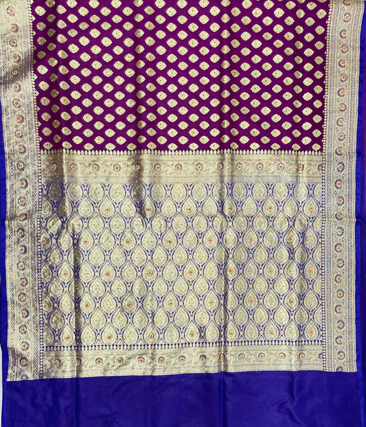 Faishana Presents Purple Katan Silk Zari Booti Heavy Stone Work Banarasi Saree with Contrast Blue Floral Pallu and Blue Blouse