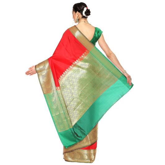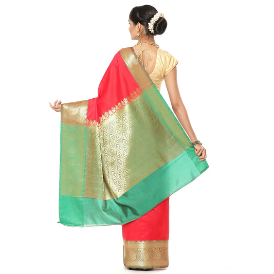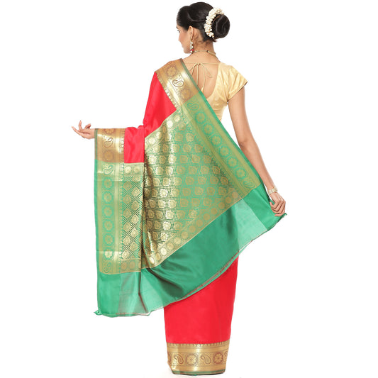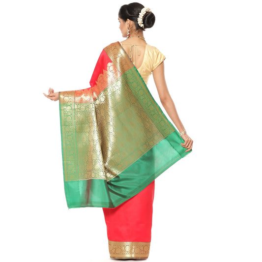 Faishana Presents Red Katan Silk Plain Zari Anchal With Contrast Green Zari Border Banarasi Saree