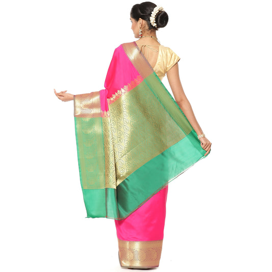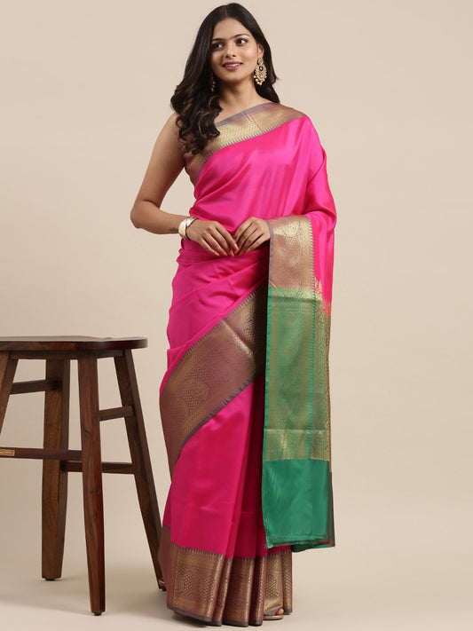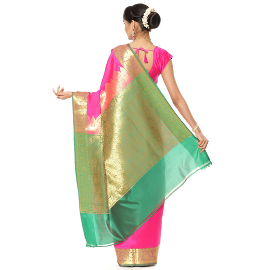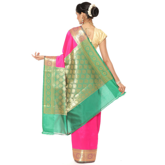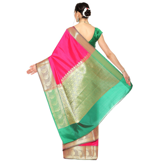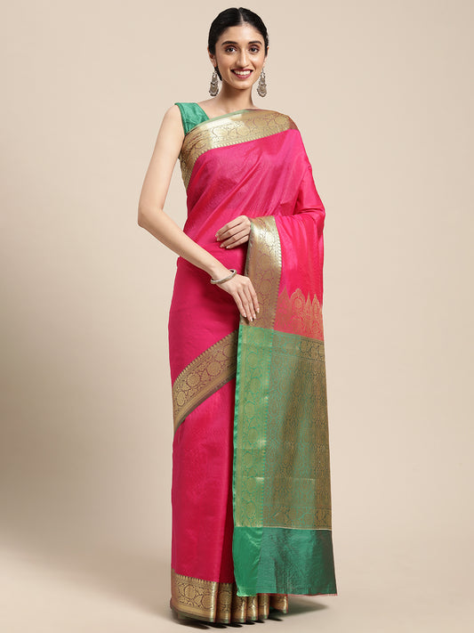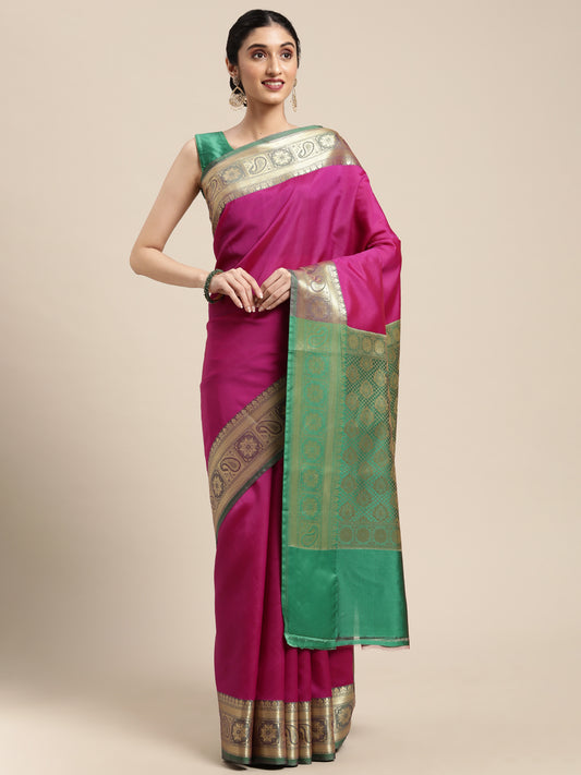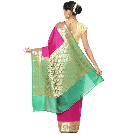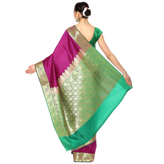 Faishana Presents Magenta Katan Silk Plain Zari Anchal With Contrast Green Zari Border Banarasi Saree