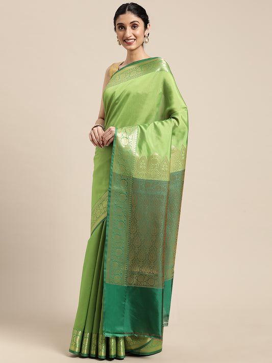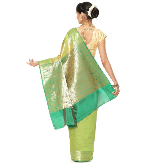 Faishana Presents Green Katan Silk Plain Zari Anchal With Contrast Green Zari Border Banarasi Saree