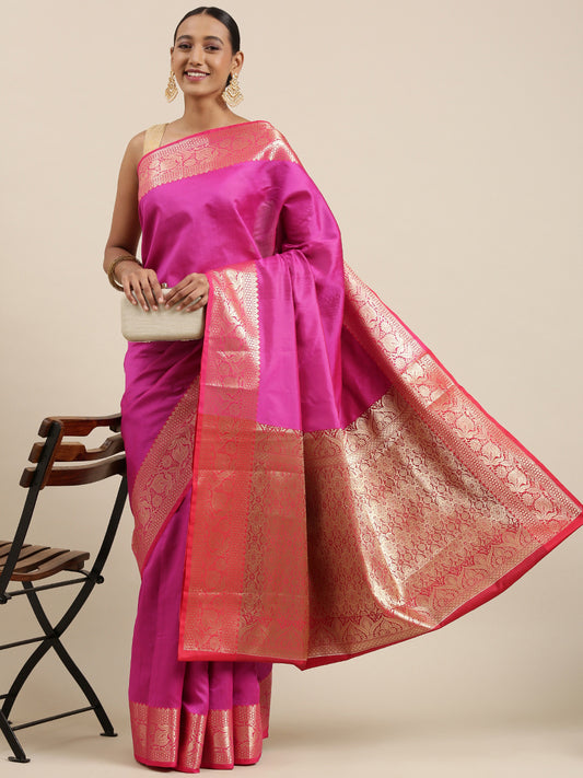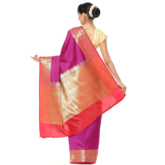 Faishana Presents Magenta Katan Silk Plain Zari Anchal With Contrast Red Zari Border Banarasi Saree