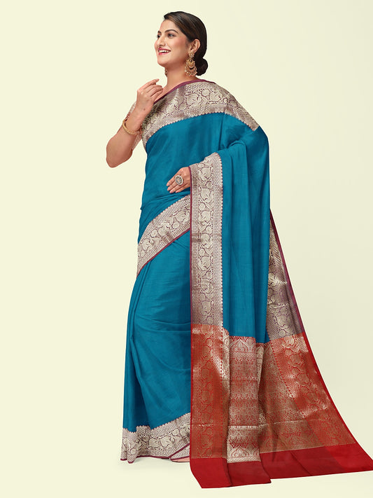 Faishana Presents Presents Cerulean Blue Katan Silk Anchal Banarasi Saree With Red Blouse