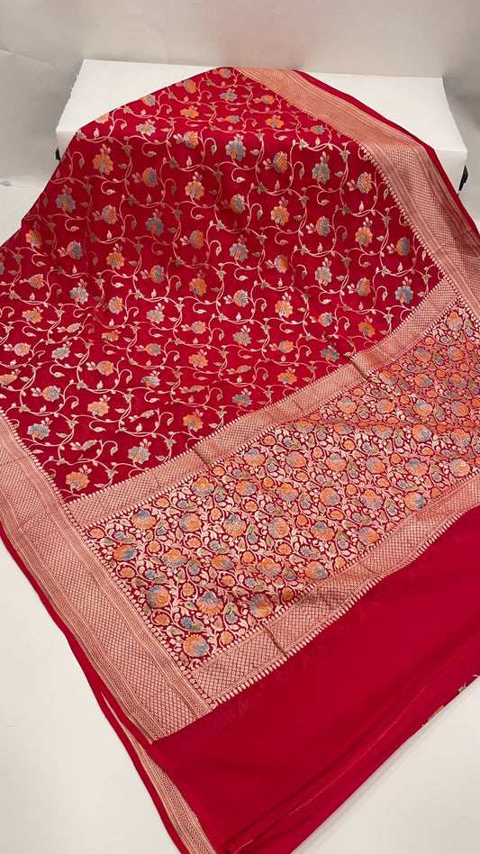 Faishana Pure Silk Handloom Exquisite Red Khaddi Georgette Hand Brush Floral Zari Kadhwa Jaal with Banarasi Zari Border with Red Blouse