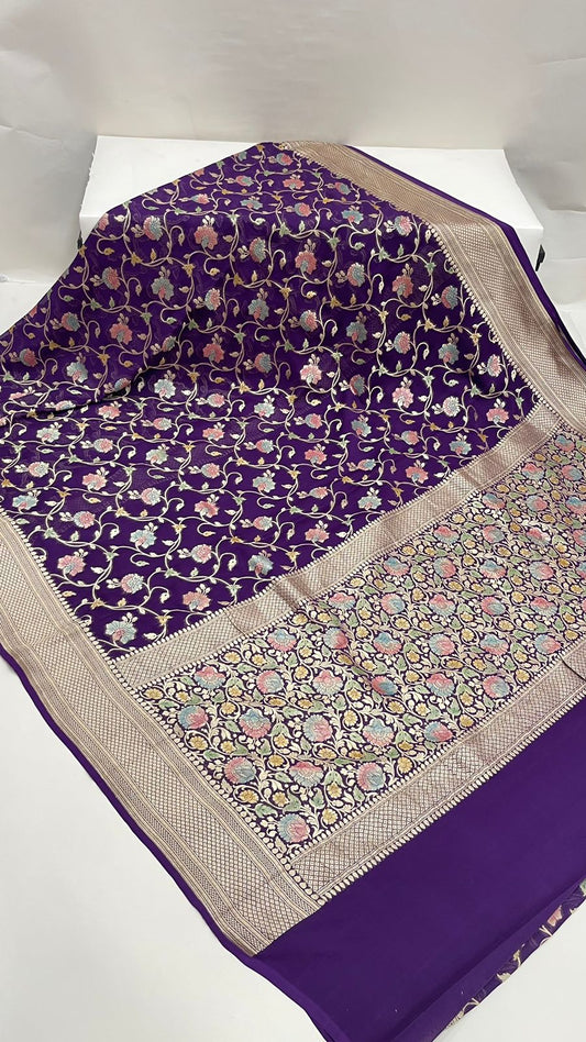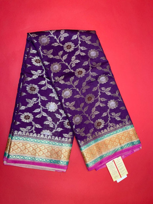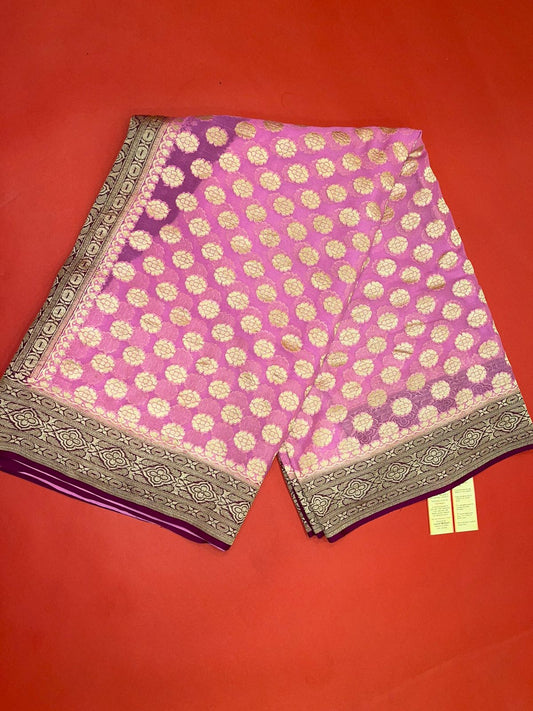 Faishana Pure Silk Handloom Exquisite Purple Khaddi Georgette Hand Brush Floral Zari Kadhwa Jaal with Banarasi Zari Border with Purple Blouse