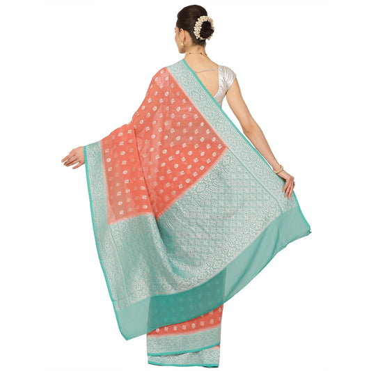 Faishana Presents Peach Pure Banarasi Khaddi Chiffon Georgette Silver Zari Booti Weaving Kadiyal Seagreen Border. with Seagreen Blousw.