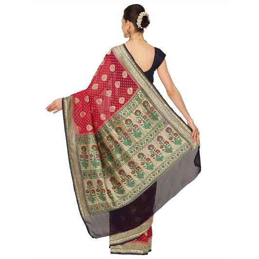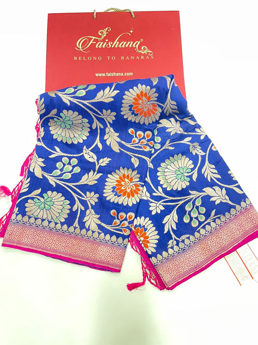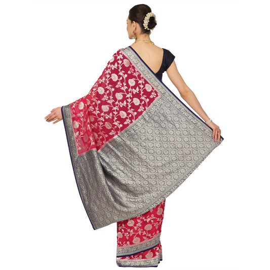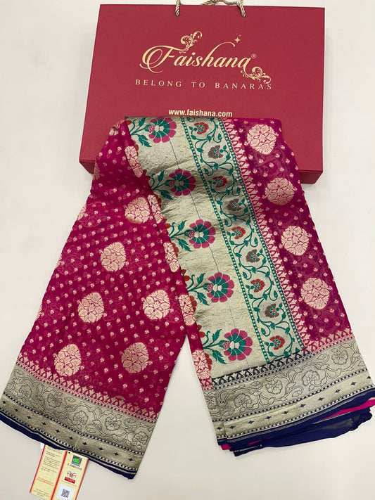 Faishana Presents Magenta Pure Banarasi Khaddi Chiffon Georgette Zari Chunri Booti Boota Paithani Anchal Weaving Kadiyal Navy Blue Border.