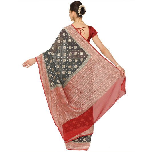 Faishana Presents Grey Pure Banarasi Khaddi Chiffon Georgette Golden Zari Meena Booti Weaving Kadiyal Red Border with Blouse.