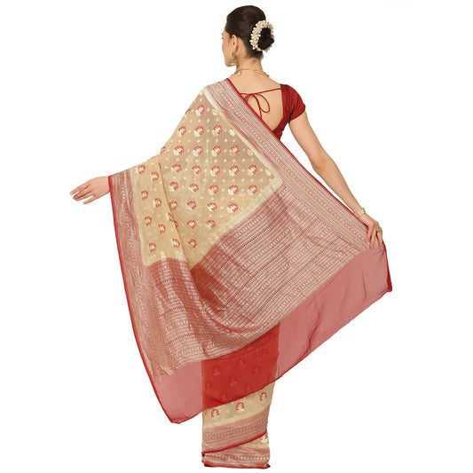 Faishana Presents Beige Pure Banarasi Khaddi Chiffon Georgette Golder Zari Meena Booti Boota Weaving Kadiyal Red Border.