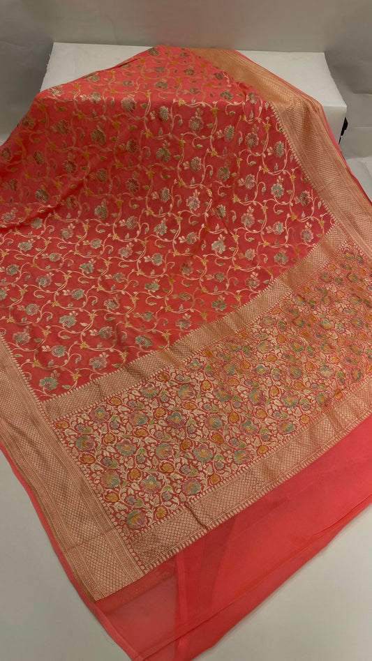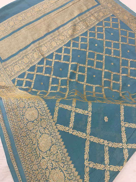 Banarasi pure khaddi georgette sarees are a stunning representation of traditional Indian craftsmanship, combining the lightweight, sheer quality of georgette with the luxurious texture of khaddi silk. These sarees are woven using twisted yarns, resulting in a rich, grainy surface that enhances their visual appeal. Characterized by intricate zari work and vibrant colors, Banarasi khaddi georgette sarees feature traditional motifs such as floral jaals and paisleys, reflecting the rich heritage of Banaras. The unique cutwork technique adds depth and sophistication, making these sarees perfect for festive occasions and celebrations.The fabric's breathable nature ensures comfort, while its elegant drape flatters all body types. Available in a variety of hues, from bold and bright to soft pastels, these sarees cater to diverse tastes and preferences. Ideal for both formal and casual events, a Banarasi pure khaddi georgette saree can be styled with statement jewelry and a chic blouse for a sophisticated look. At Faishana, known for its high-quality and elegant sarees, a Khaddi Georgette saree would likely embody the brand's commitment to craftsmanship and style.