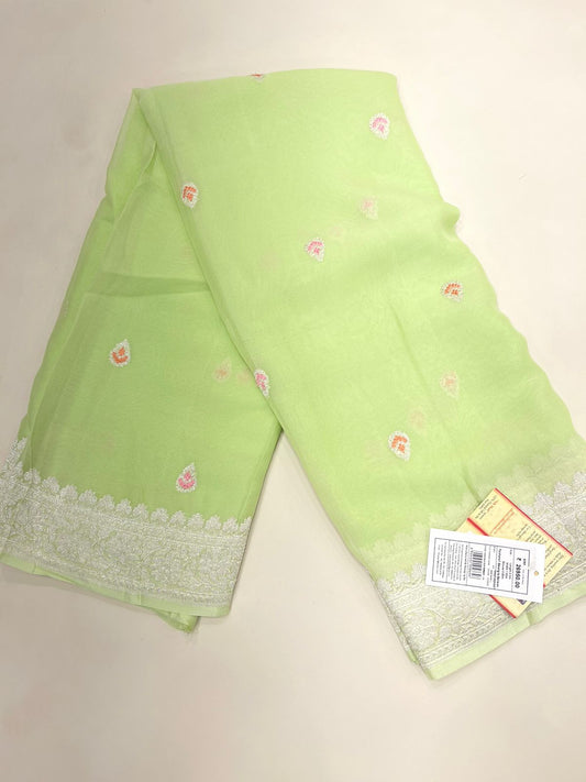 Faishana Presents Green Pure Banarasi Khaddi Chiffon Georgette Zari Boota Weaving Kadiyal 3D Border.