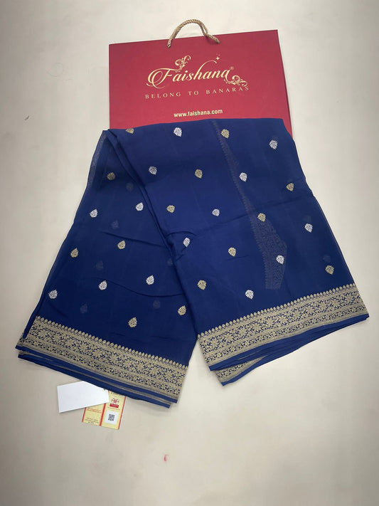 Faishana's Exquisite Pure Silk Handloom Khaddi Georgette Saree with Navy Blue and Golden Zari Kadhwa Booti Zari Border
