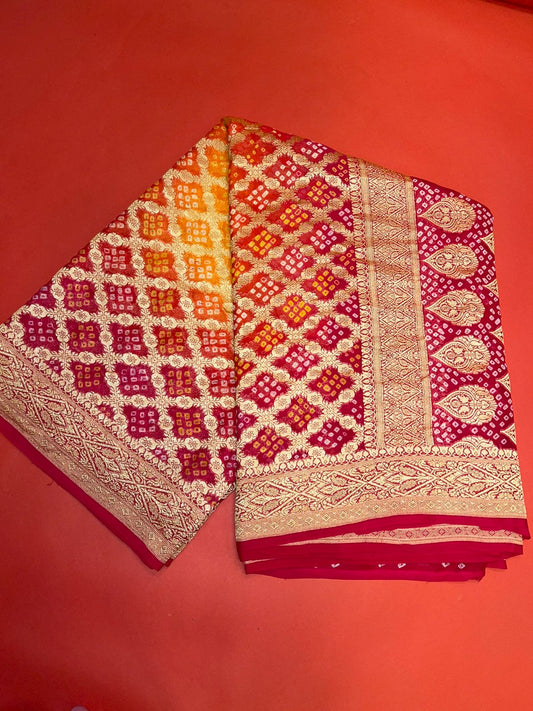 Faishana Pure Handwoven Pink Khaddi Georgette Kadhwa Bandhej Zari Jaal Saree with Banarasi Kadhwa Golden Zari Floral Border with Kadhwa Pink Blouse