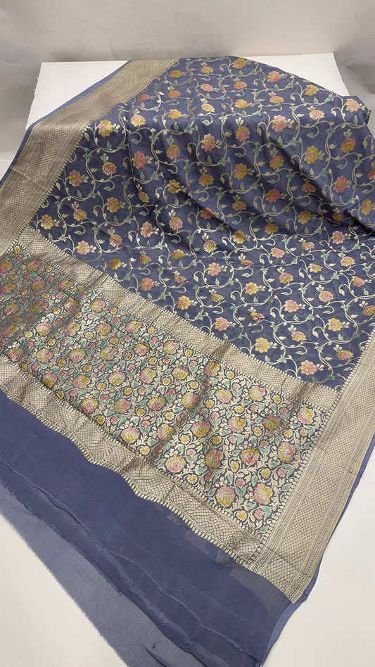 Faishana Pure Silk Handloom Exquisite Grey Khaddi Georgette Hand Brush Floral Zari Kadhwa Jaal with Banarasi Zari Border with Grey Blouse