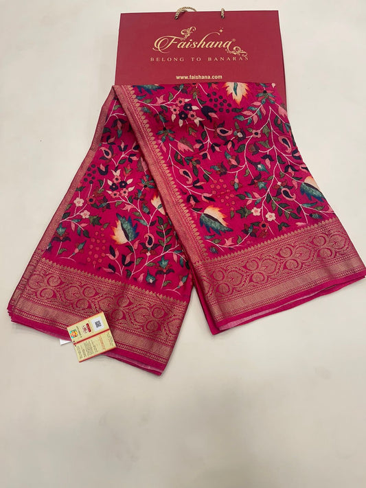 Faishana Pure Silk Handloom Pink Katan Georgette Digital Printed Zari Floral Jaal Kadhwa Banarasi Border with Pink Blouse.