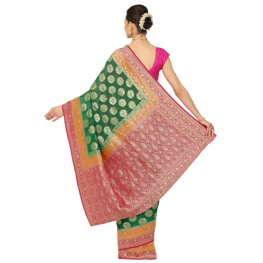 Faishana Presents Parrot Green Pure Banarasi Khaddi Chiffon Georgette Meena Gharchola Weaving Kadiyal Pink Border with Pink Blouse.