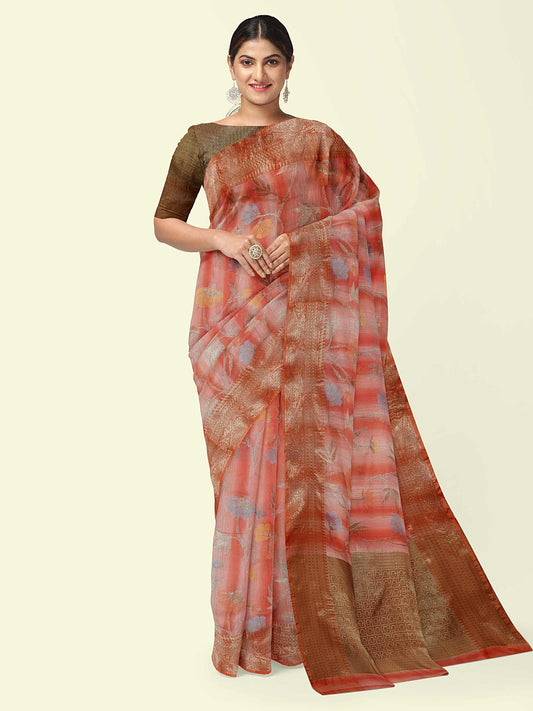 Faishana Presents Handwoven Rust Peach Matka Silk Boota Skirt Border With Orange Blouse Banarasi Saree