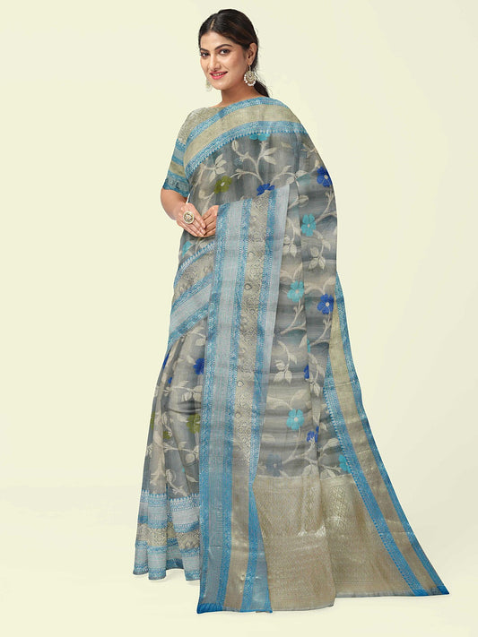 Faishana Presents Handwoven Grey Matka Silk Boota Skirt Border With Blue Blouse Banarasi Saree