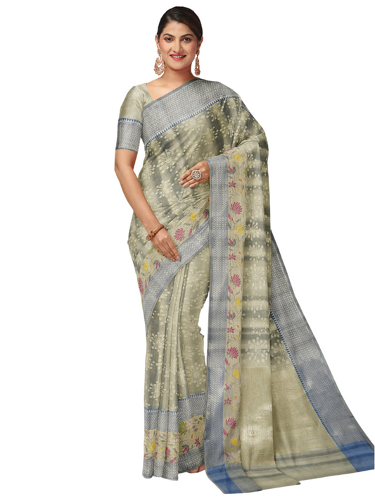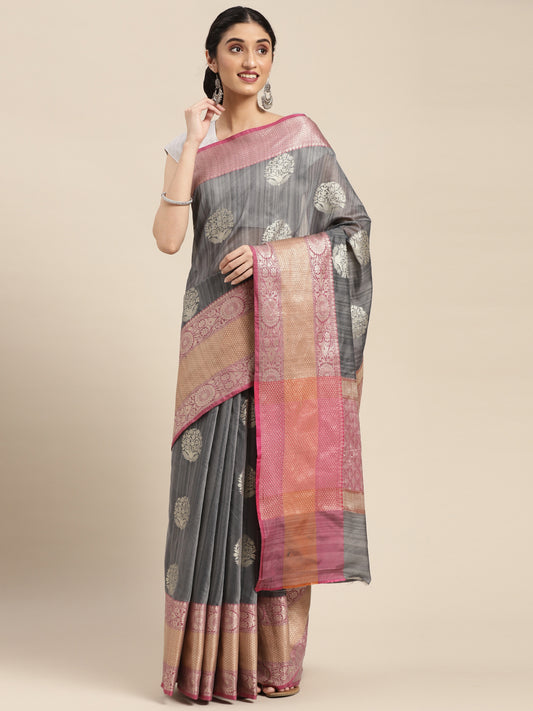 Faishana Presents Handwoven Grey Matka Silk Boota Skirt Border With Grey Blouse Banarasi Saree